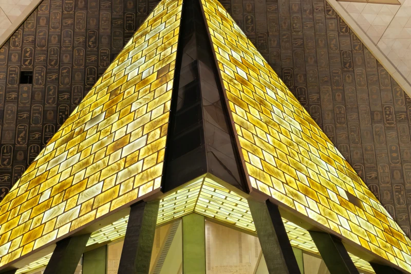 The architectural design of the Grand Egyptian Museum is a harmonious blend of modernity and ancient Egyptian aesthetics. The main building, designed by the internationally acclaimed architecture firm Heneghan Peng, is a stunning structure that echoes the grandeur of the pyramids. Its sleek, angular design is inspired by the triangular form of the pyramids, while its translucent stone cladding pays homage to the traditional Egyptian architectural style.
